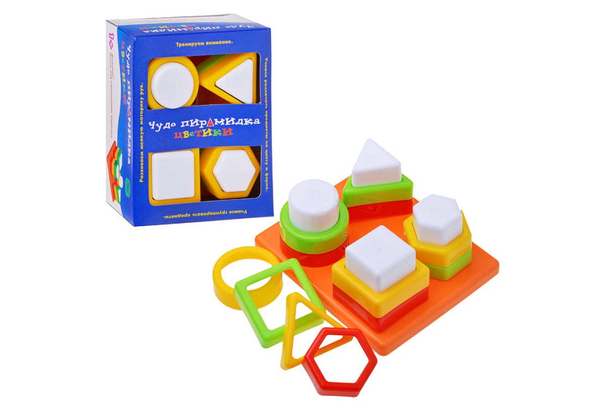 • В комплекте: подставка с 4-мя столбиками в виде разных геометрических тел, 12 цветных фигур разной геометрической формы.