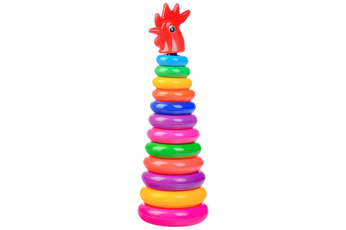 Комплектация: 12 цветных колец (диаметром от 6.5 до 15 см), 1 конусообразный стержень, наконечник в виде головы петуха.