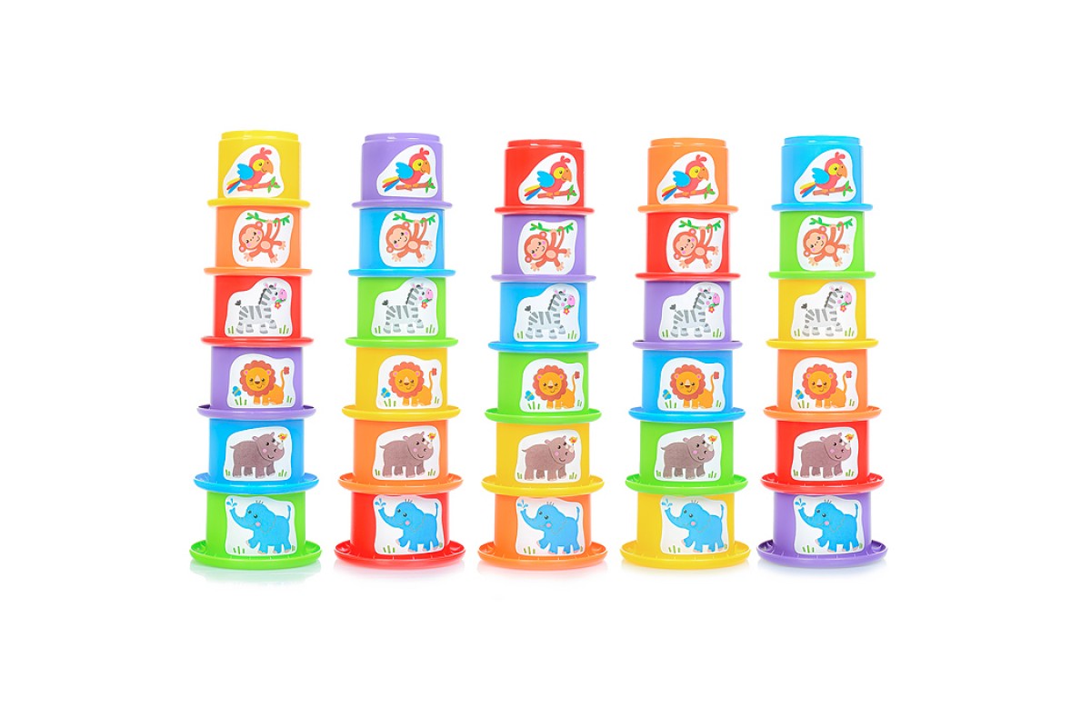 • Пирамида состоит из 6 стаканчиков разного размера. Размер пирамидки: 10х10х32 см. Диаметр стаканчиков: 8-10 см.