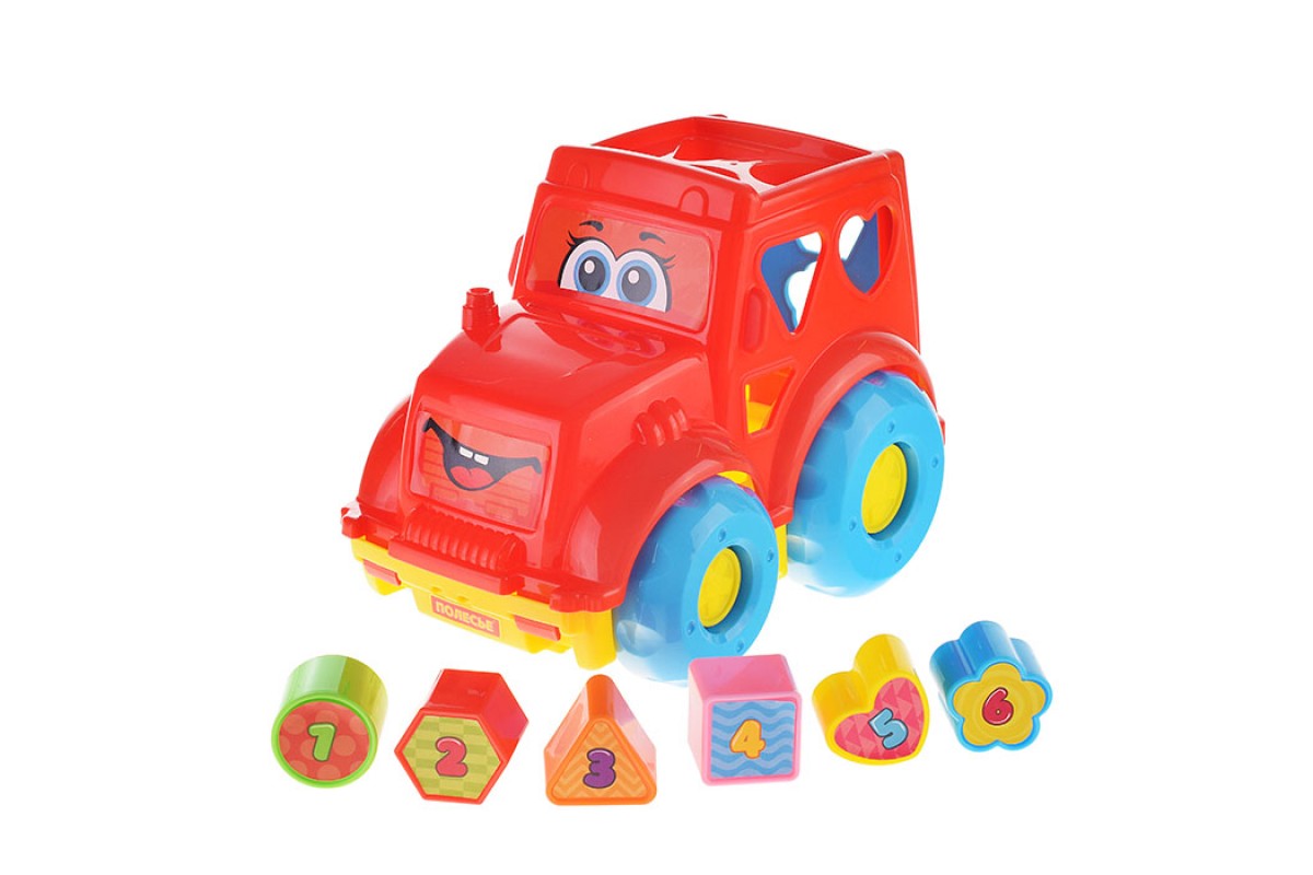 Конструкция предполагает наличие отверстий разных форм в кузове автомобиля. Данным отверстиям соответствуют пластмассовые фигурки: круг, ромб, треугольник, квадрат, сердечко и цветок. Перед малышом стоит задача поместить каждую фигуру в соответствующую ячейку, а затем достать фигурки, открыв багажник трактора, чтобы снова начать игру.