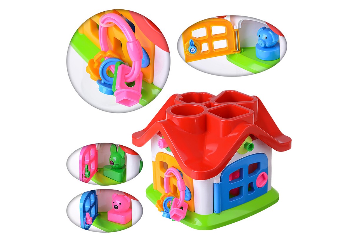 • Внутри теремок разбит на 4 комнаты. За каждой дверкой есть жилец: мишка, зайчик, кошка, поросёнок. В теремок они попадают через отверстия в крыше: сажаем их в дырочку, нажимаем на кнопочку (для каждого своя) и зверёк проскакивает в комнату.