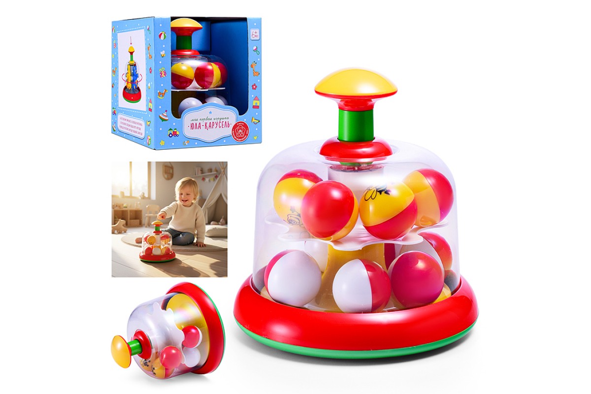 • Юла прочно стоит на поверхности и «не убегает» от малыша, поэтому он может играть с ней даже в одиночестве.