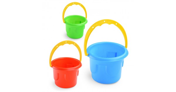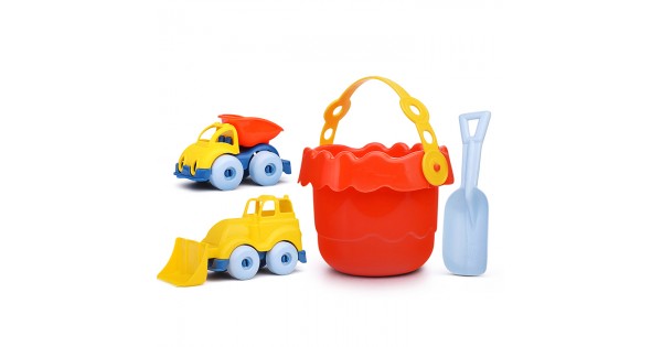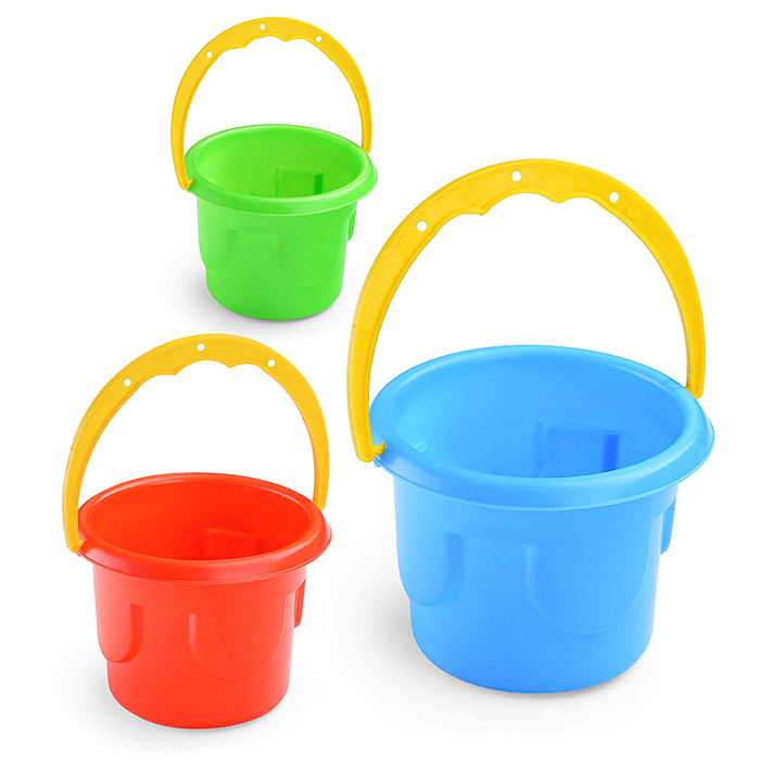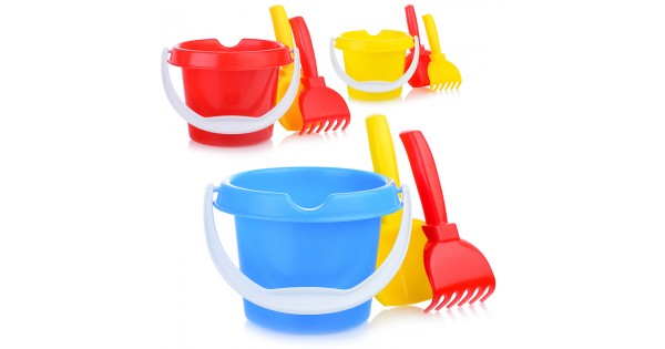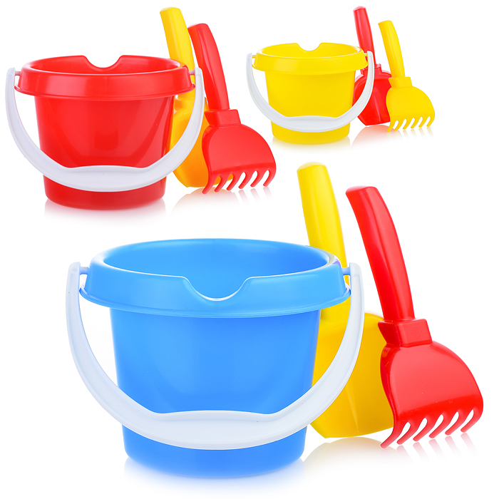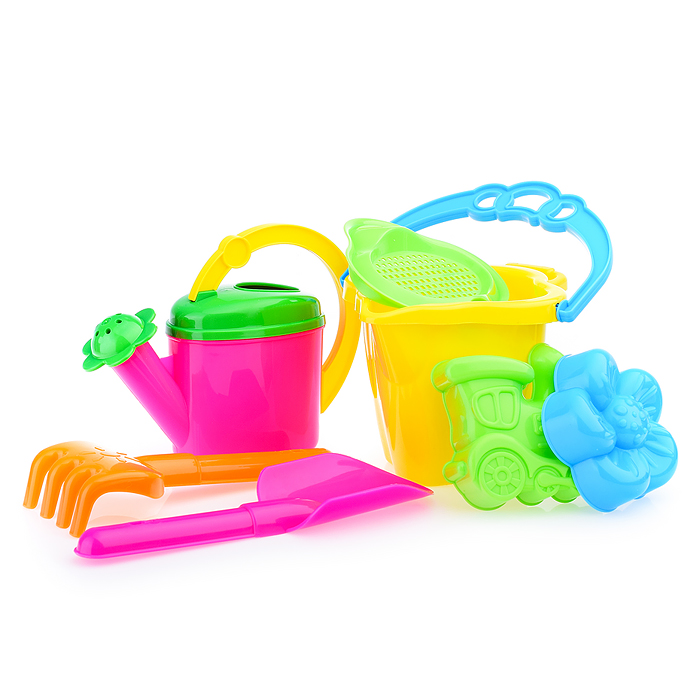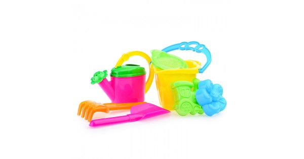 Песочный набор №114 (ведро 0,6л кувшин, лейка 0,3 л, сито, 2 формочки, лопатка 19см, грабли 19 см )