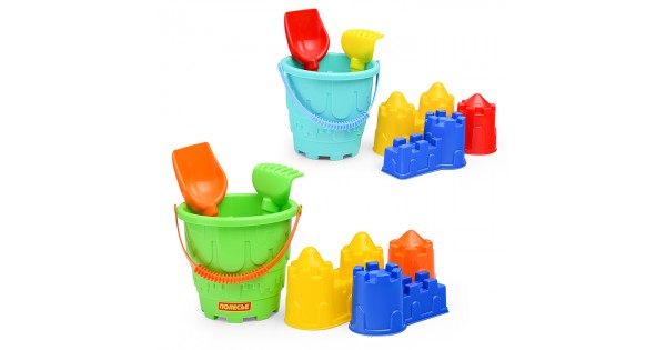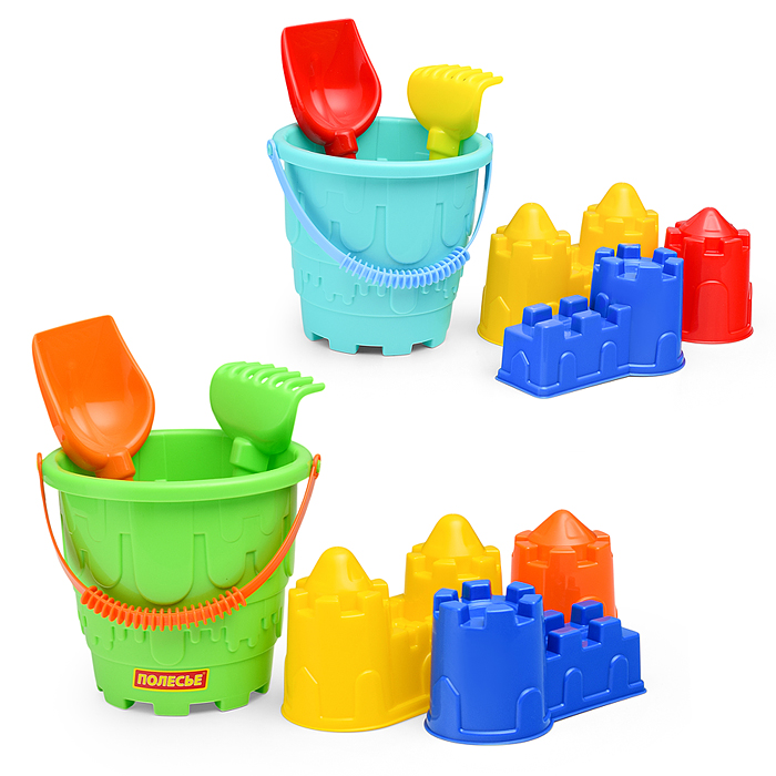 Набор №524: Ведро-замок большое, лопатка №5, грабельки №5, формочки (замок башня + замок стена с двумя башнями + замок мост)