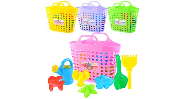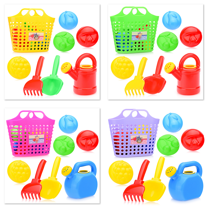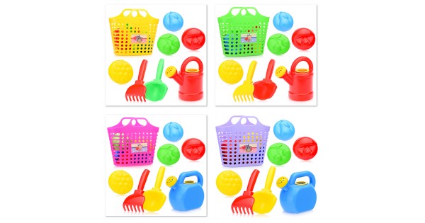 Песочный набор в корзинке "Садовый " ( 4 формочки, совок, грабли, леечка )