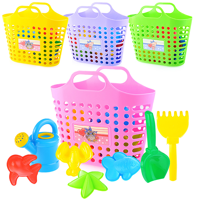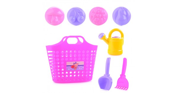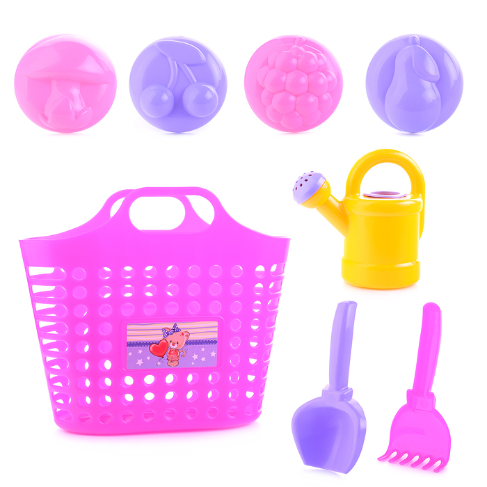 Детский песочный набор 8 пр (сумка-корзина, лейка-мини, совок, грабли, формы 4 шт)