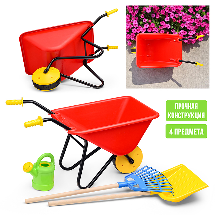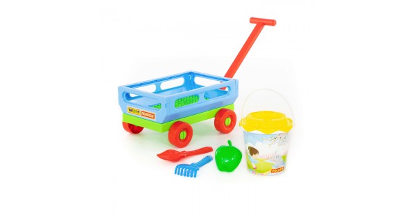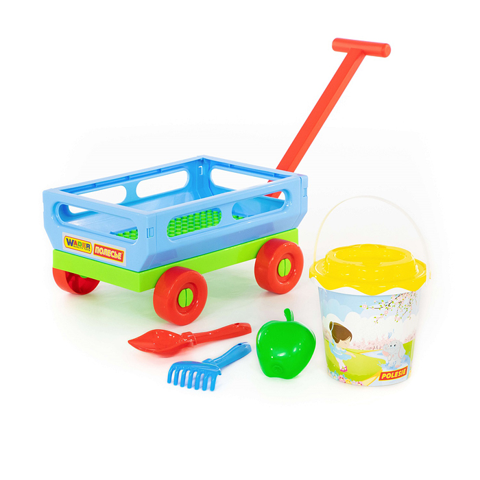 Набор №420: Тележка с ручкой №2 + Ведро с наклейкой, ситечко "Солнышко", лопатка №5, грабельки №5, формочка "Фрукты"