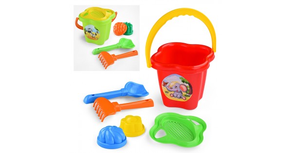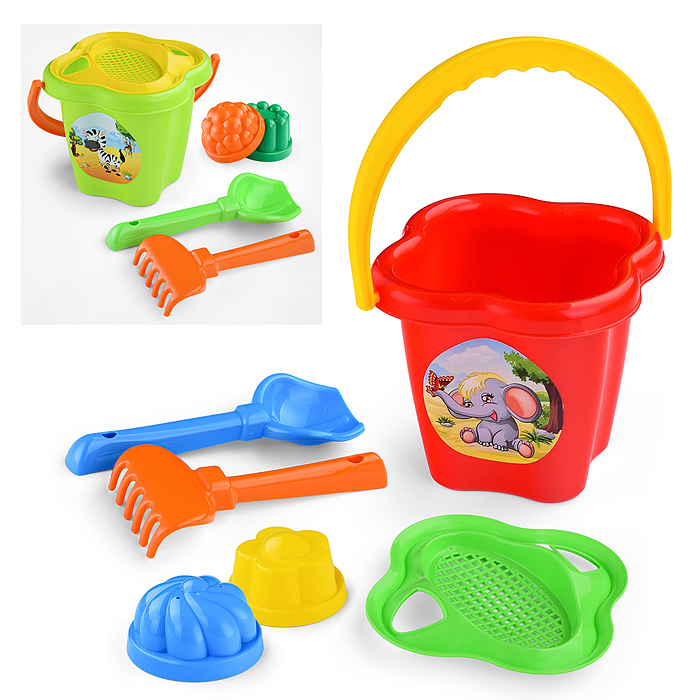 Набор №36: ведро-цветок среднее, ситечко-цветок, совок №2, грабельки №2, 2 формочки