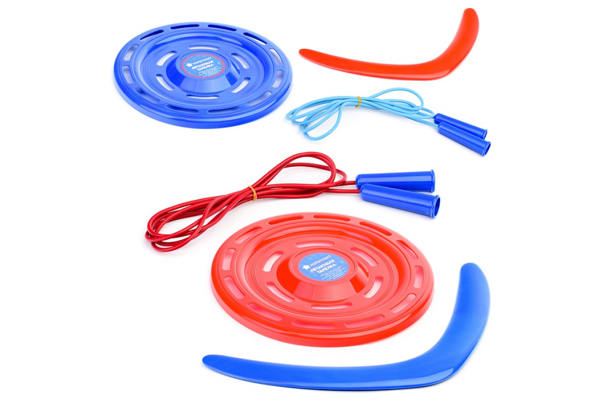 • Комплектация: бумеранг (38см.), летающая тарелка (22 см.), скакалка гимнатсическая (2,5 м.).