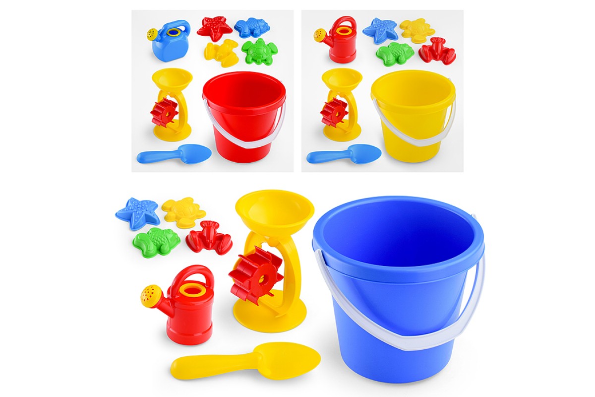 В наборе: яркое пластиковое ведерко, мельничка, совочек, грабельки, леечке, формочки 4 шт.