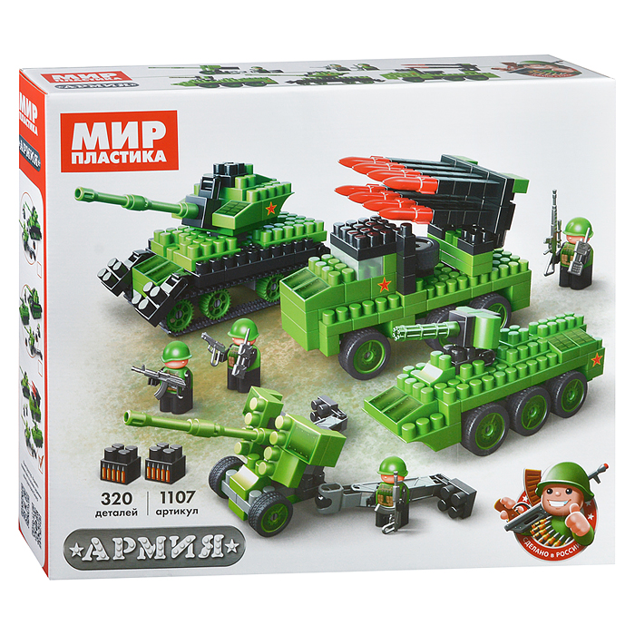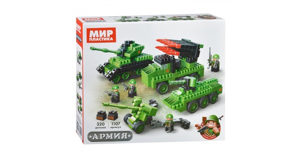 Конструктор 1107 "Армия" набор с танком, БТР, РСЗО и гаубицей.