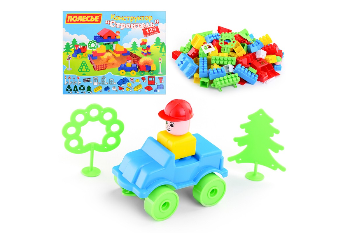 • В комплект набора входит 129 элементов (строительные блоки, детали для сборки паровозика, машинки и тележки, 2 фигурки человечков, дорожные знаки, деревья, забор, окна, двери, крыша).