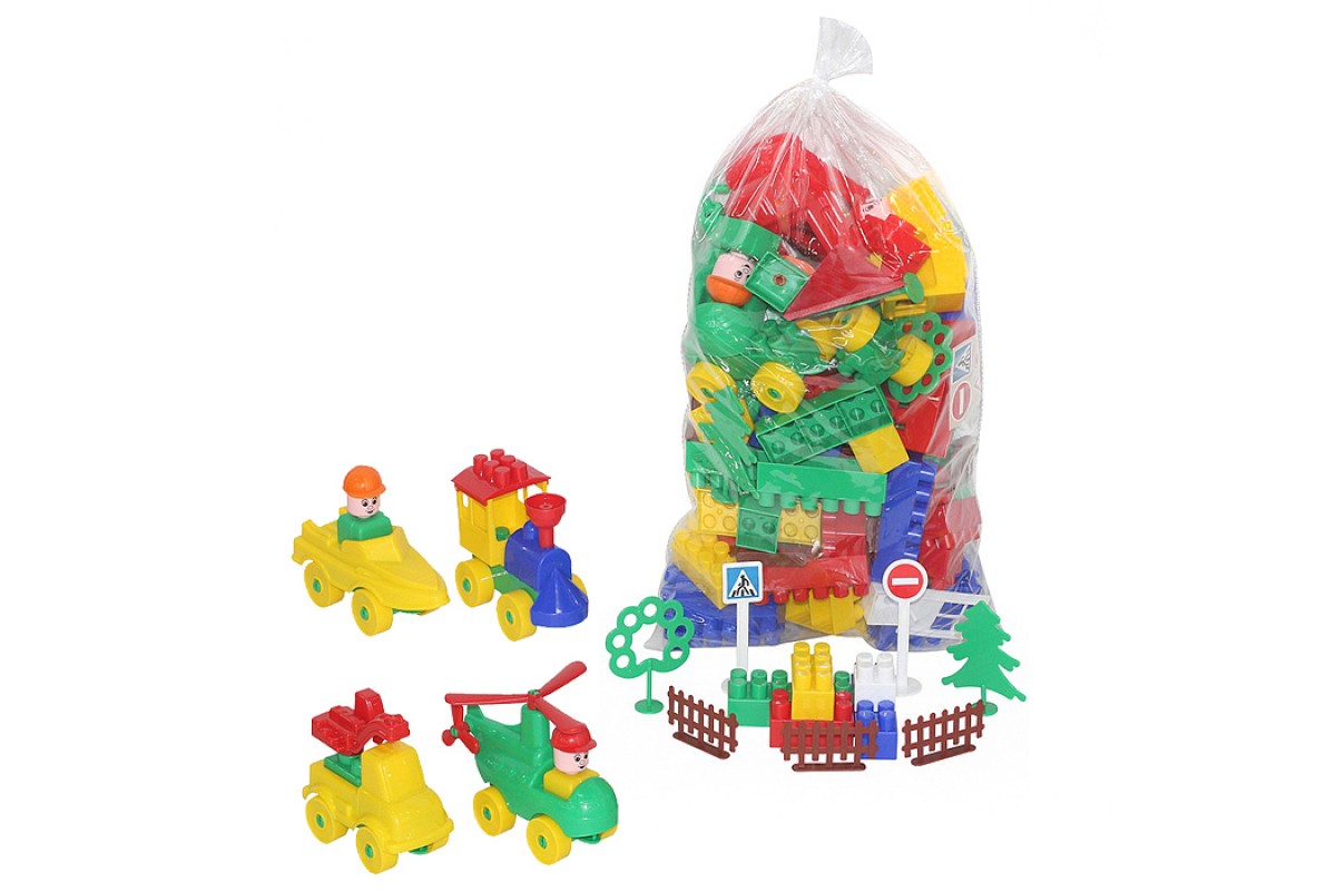 • В наборе 348 элементов: стандартные строительные блоки (3 вида) по 64 шт., детали 7 фигурок человечков (21 шт.), детали корпуса 9 различных видов транспорта: самолет, вертолет, паровоз, вагон, грузовик, катер, джип, трактор, легковой автомобиль (23 шт.), колёса (38 шт.), платформа под колёса (9 шт.), дорожные знаки (4 шт.), забор (16 шт.), окна (12 шт.), двери (4 шт.), элементы крыши (17 шт.), деревья (12 шт.).