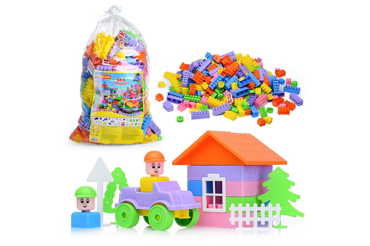 • В наборе 363 элемента: стандартные строительные блоки (3 вида) по 86 шт., фигурки человечков (2 шт.), транспорт, дорожные знаки, ограждения, окна, двери, элементы крыши, деревья.