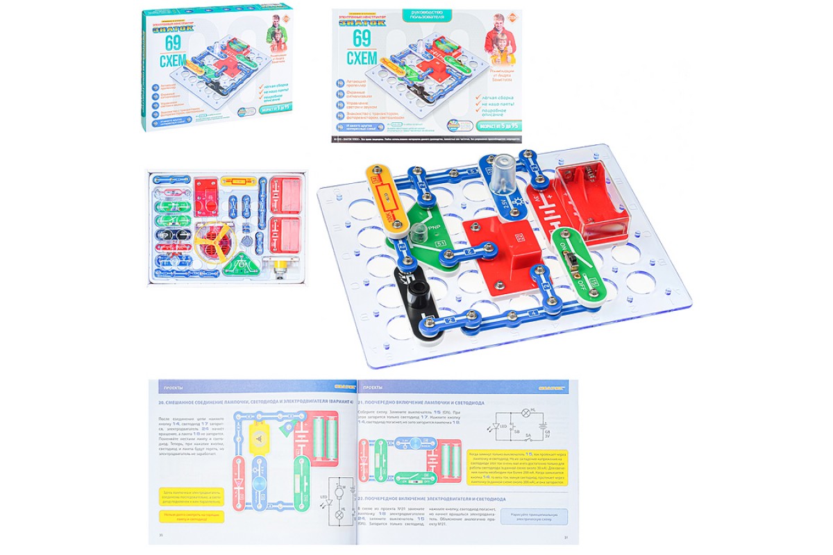 Благодяря этому набору, вы легко сможете собрать такие схемы, как: "Летающий пропеллер", "Охранные сигнализации", "Управление светом и звуком", "Знакомство с транзистором, фоторезистором, светодиодом" и много других интересных схем!