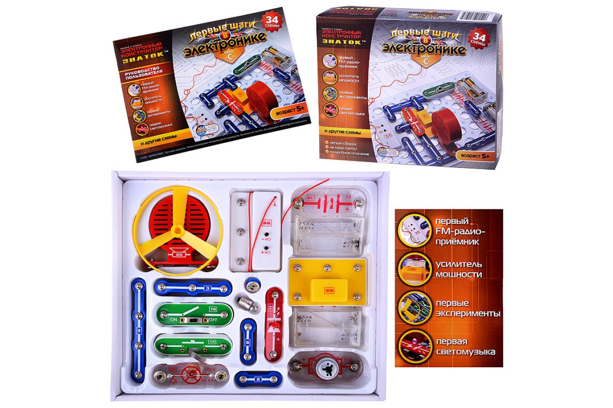 • Из деталей конструктора можно собрать 34 электронные схемы.
