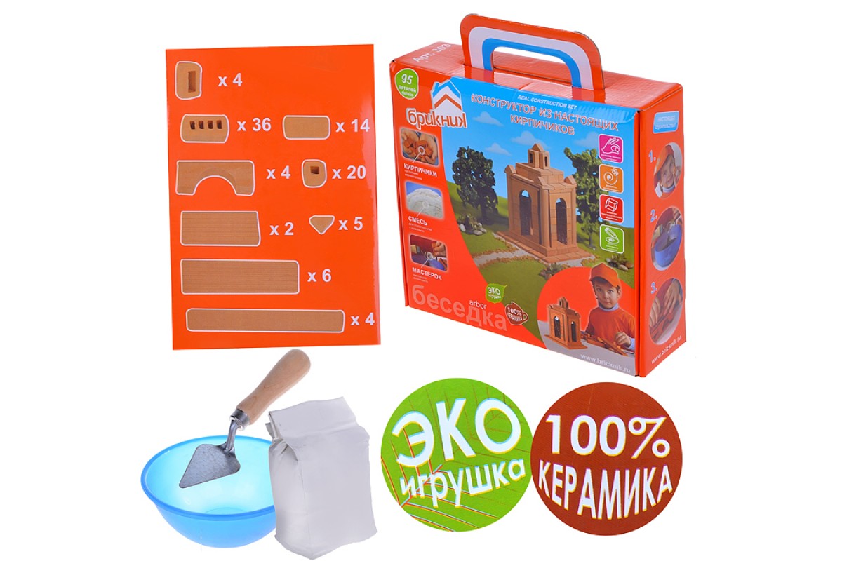 • Кроме того, в наборе конструктора «Беседка» от Brickmaster – строительная смесь из кукурузного крахмала и песка, которая подойдет в качестве «цемента», а также мисочка и мастерок из качественного металла и дерева.