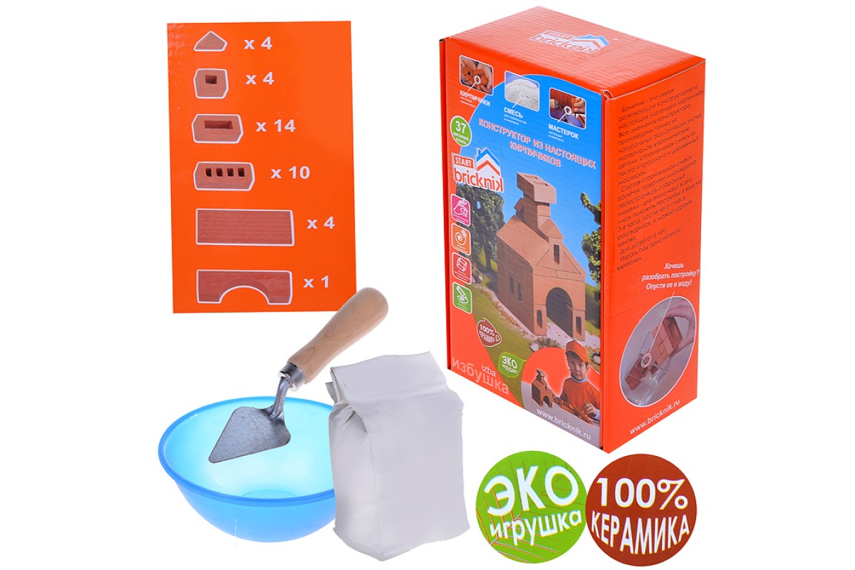 С помощью строительной смеси, состоящей из речного песка и кукурузного крахмала, кирпичики соединяются между собой и в результате получается великолепная постройка. Смесь не пачкает руки и легко растворяется в воде. Строить можно как по инструкции, так и возводя сооружения собственного воображения: загородный коттедж или небольшой замок. Любую постройку можно разобрать, если оставить ее на несколько часов в воде, и использовать кирпичики снова.