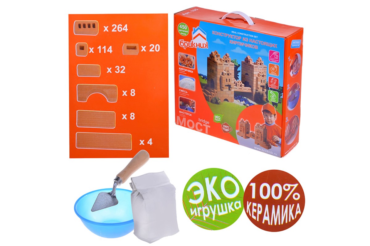 • Кроме того, в наборе конструктора «Мост» от Brickmaster – строительная смесь из кукурузного крахмала и песка, которая подойдет в качестве «цемента», а также мисочка и мастерок из качественного металла и дерева.