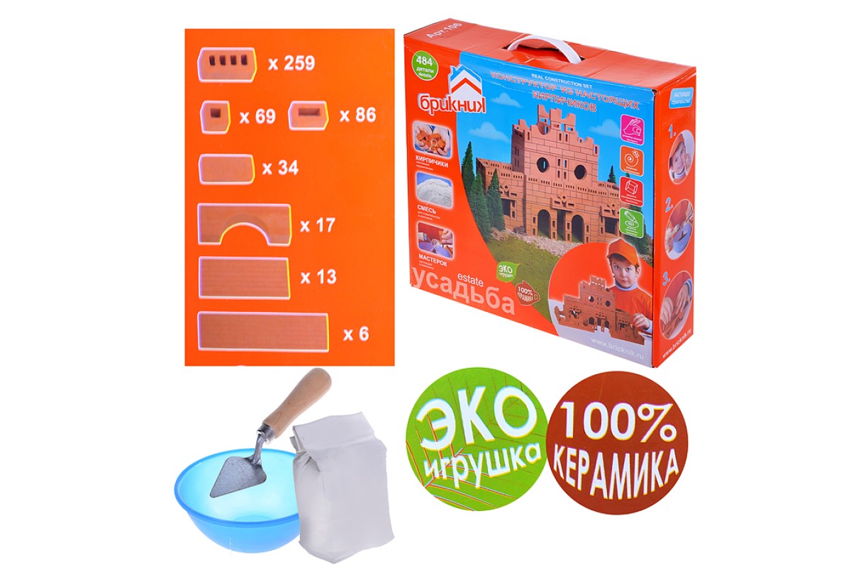 • Кроме того, в наборе конструктора «Усадьба» от Brickmaster – строительная смесь из кукурузного крахмала и песка, которая подойдет в качестве «цемента», а также мастерок из качественного металла и дерева.