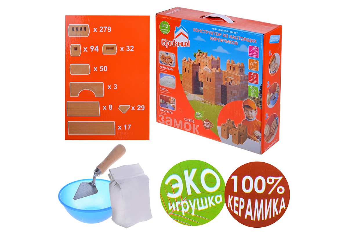 - Набор содержит 514 кирпичиков разной формы из натуральной глины и строительную смесь, с помощью которой ребёнок сможет создать замок или придумать свою оригинальную постройку из кирпичиков.