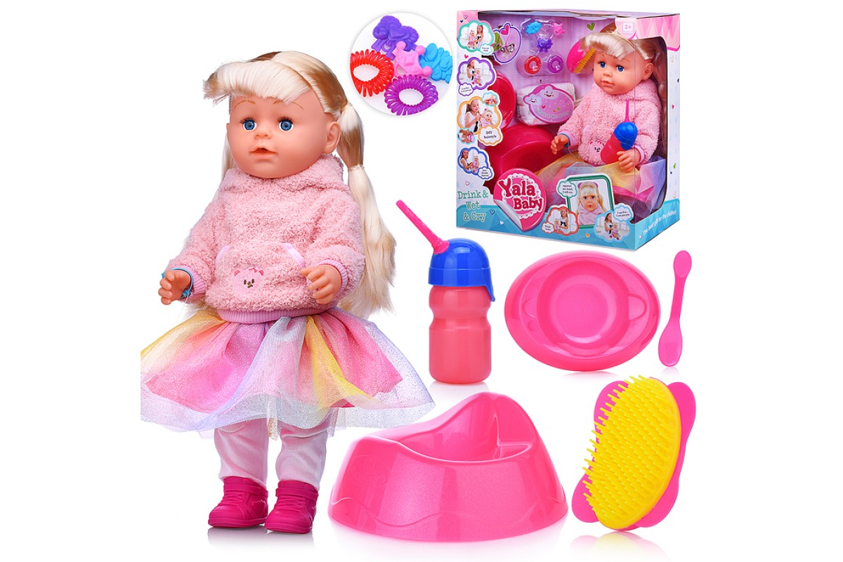 • В комплекте: бутылочка, горшок, соска, памперс, тарелочка с ложечкой, расческа.