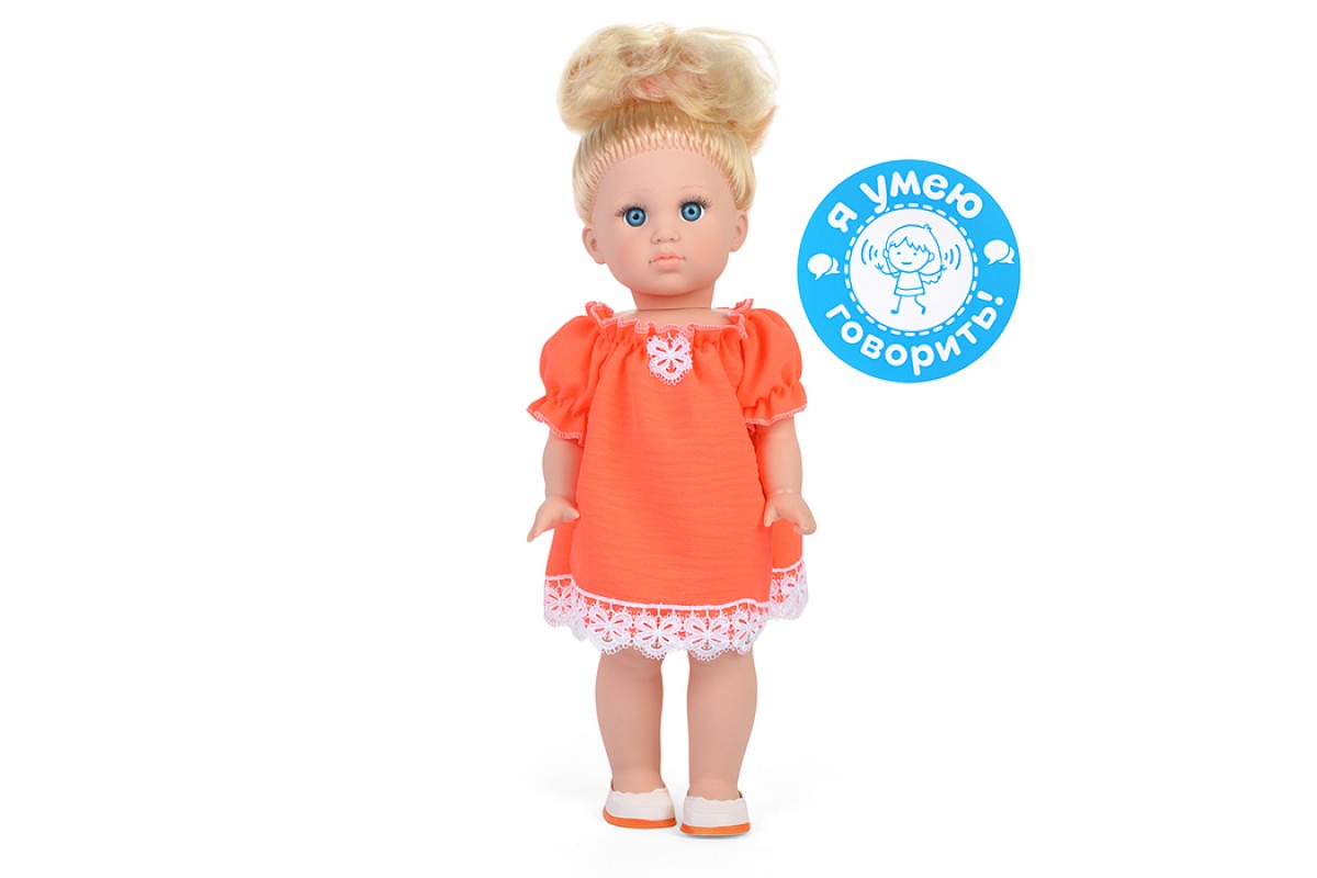 Кукла озвучена на русском языке, произносит слова, смех и плачь.