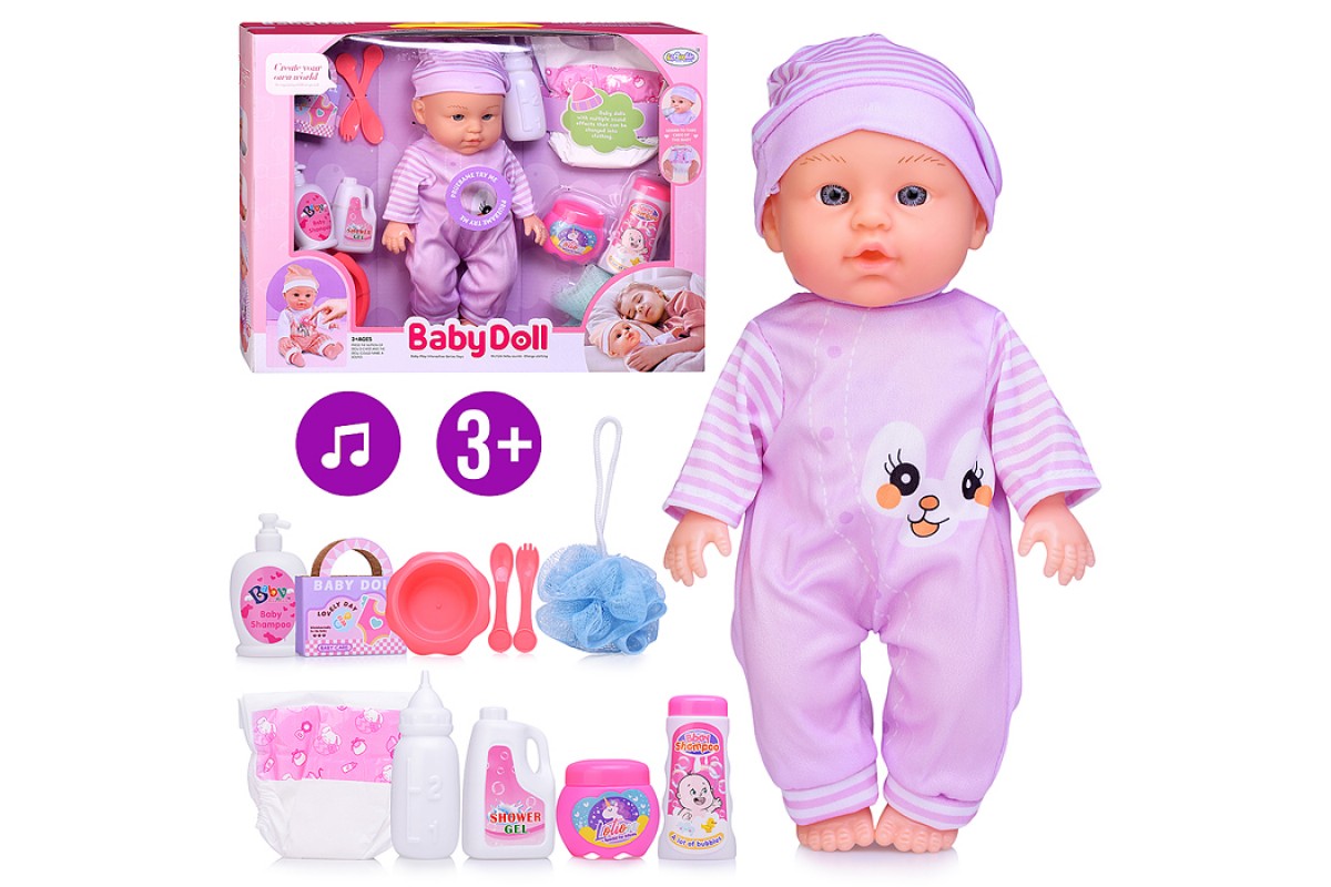 • В комплекте: бутылочка, памперс, тарелочка, вилка, ложка, мочалка, сумочка, баночки.