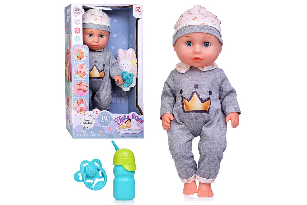 • Воспроизводит детские звуки на английском языке (мама, папа, смеётся, плачет) при нажатии на звуковой модуль, расположенный в животе.