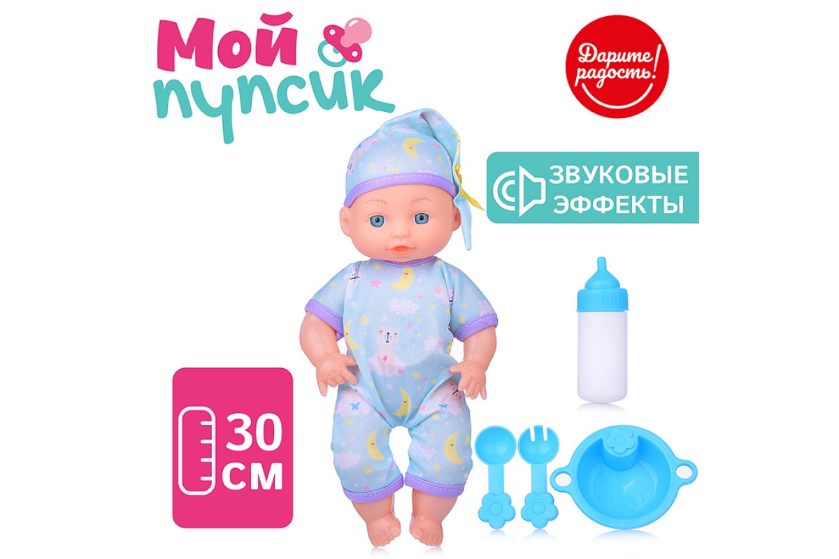 Воспроизводит детские звуки (мама, папа, смеётся, плачет) при нажатии на звуковой модуль, расположенный в груди.