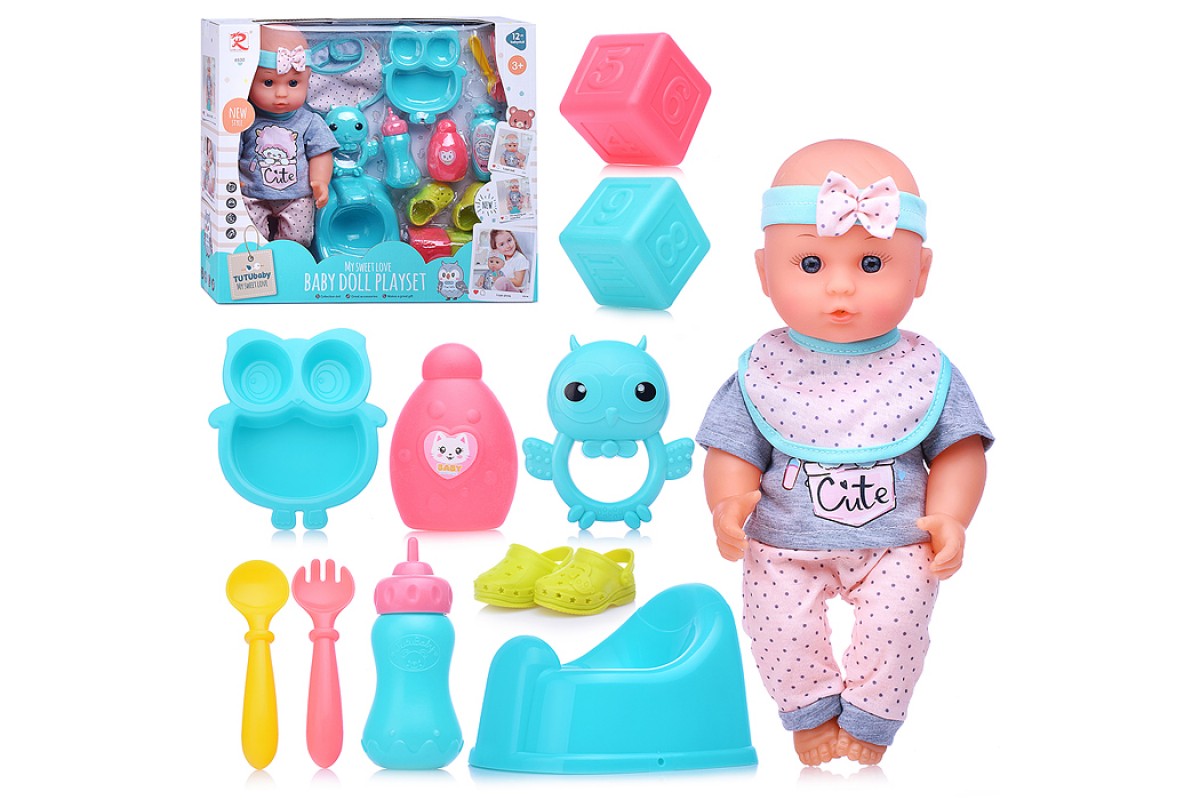 • В комплекте: бутылочка, горшок, тарелка, вилка, ложка, 2 кубика, погремушка, аксессуары.