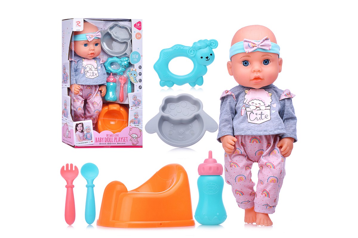 • В комплекте: бутылочка, горшок, тарелка, вилка, ложка, погремушка.