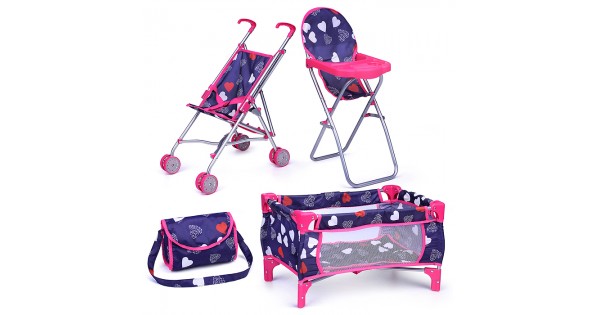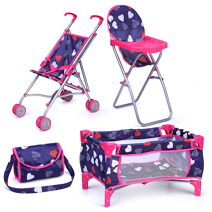 Кукольный набор (коляска, манеж, сумка, стульчик), цвет сердце на черном