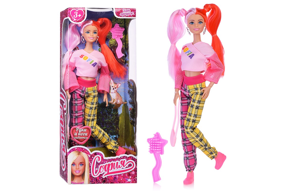 Модница-София одета в кофту с принтом и яркие брюки. Образ куколки дополняют модные крупные серьги и элегантная сумочка. Одежду и аксессуары легко снять и надеть. С такой модной куклой девочке будет интересно и весело играть: благодаря тому, что руки и ноги куклы подвижны, им можно придать любое положение. У Софии длинные красивые волосы, которые хозяйка куклы сможет заплетать в разные причёски. Детально проработанный дизайн игрушки вдохновит девочку на новые игровые сюжеты.