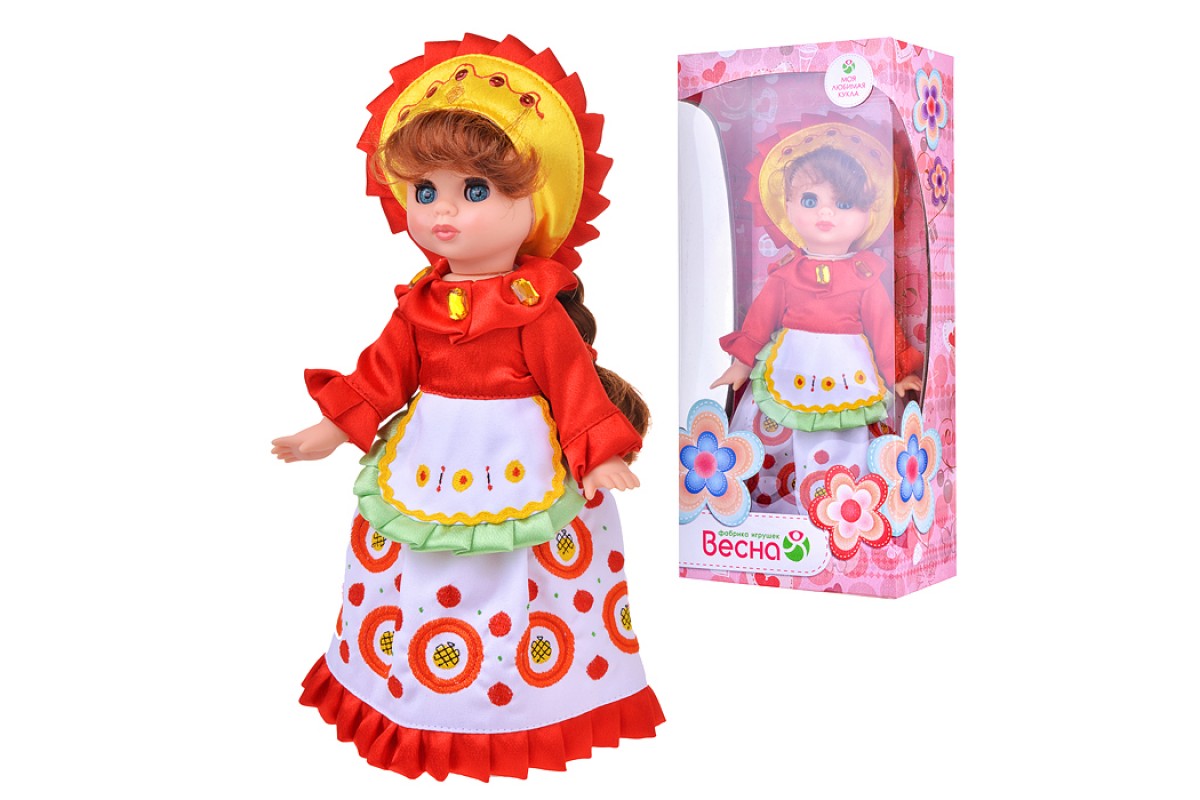 • В комплект национальной одежды куклы входит платье, фартук, кокошник с вышивкой, стилизованной под узоры дымковской игрушки. Комплект дополняют туфли. Наличие легкоснимаемых и одеваемых элементов одежды разнообразит сюжетно-игровой процесс с этой куклой, в результате которого развивается мелкая моторика и творческое воображение ребёнка.