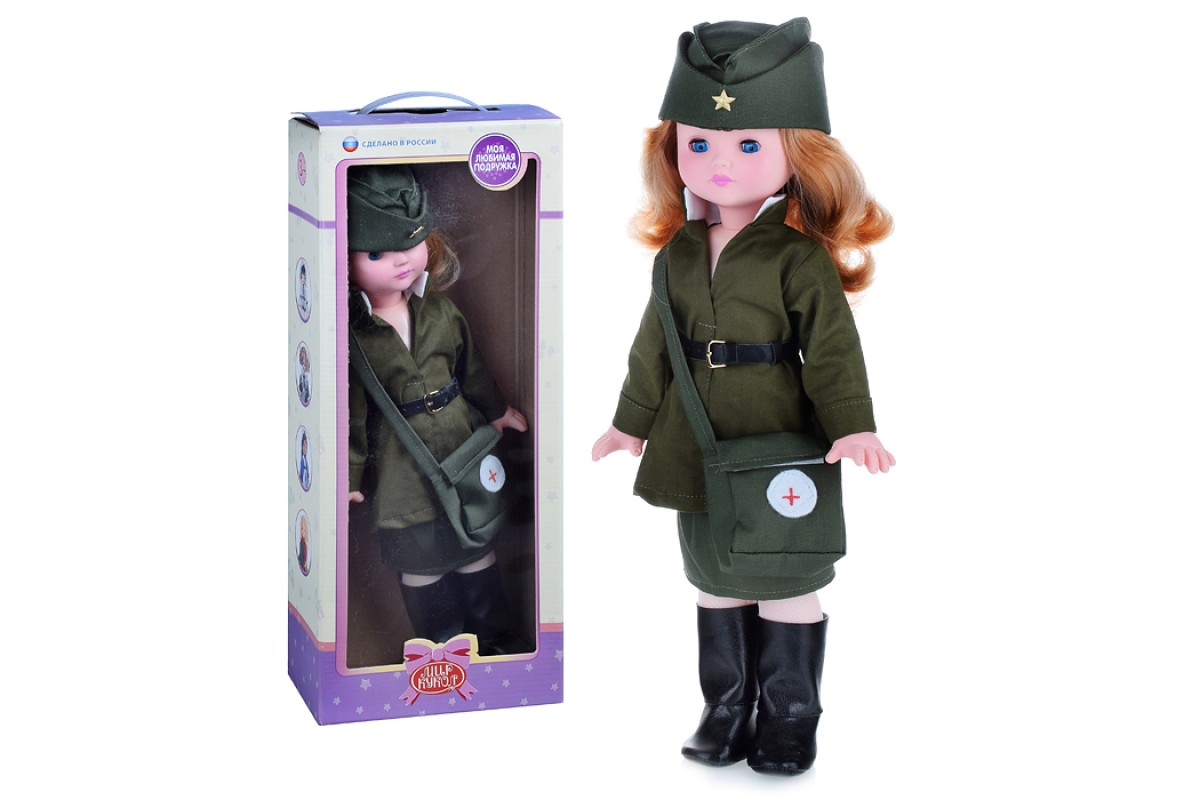 Кукла одета в гимнастёрку, юбку и пилотку; на ножках колготки и сапожки из искусственной кожи.