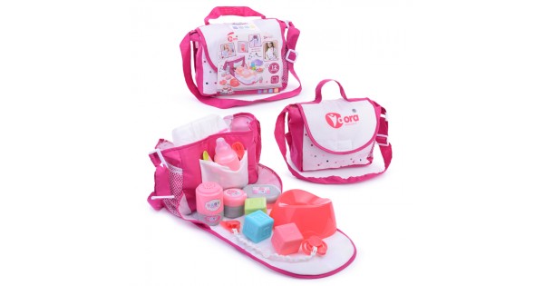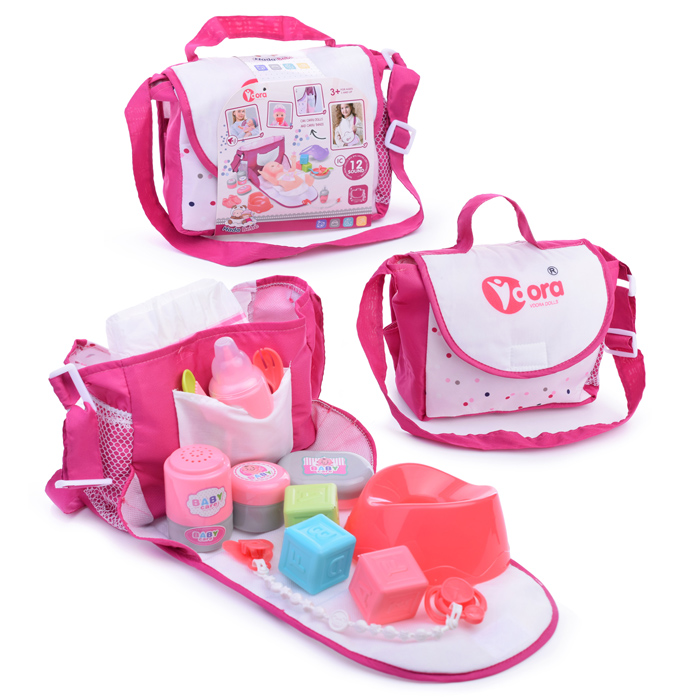 Аксессуары для куклы (сумка, горшок, тапочки, посуда) в рюкзаке