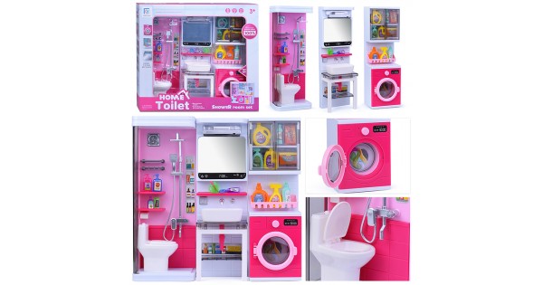 Набор мебели для кукол "Ванная" (душ, унитаз, стиральная машина, зеркало) на батарейках, розовая, в коробке