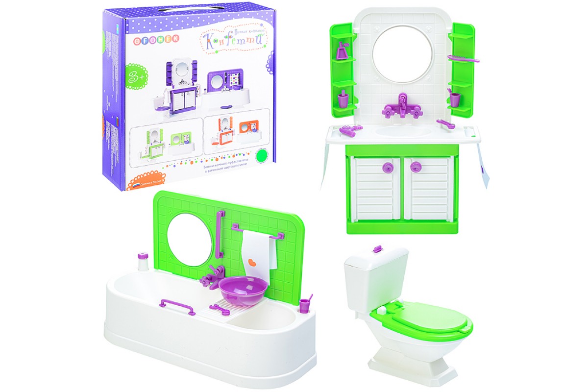 - Миниатюрные аксессуары: 2 коврика, 3 полотенца, 2 стаканчика, 2 зубные щётки, 1 таз, флакон, флакон с пробкой, расчёска, решётка на ванну, фен, 2 наклейки-зеркало.