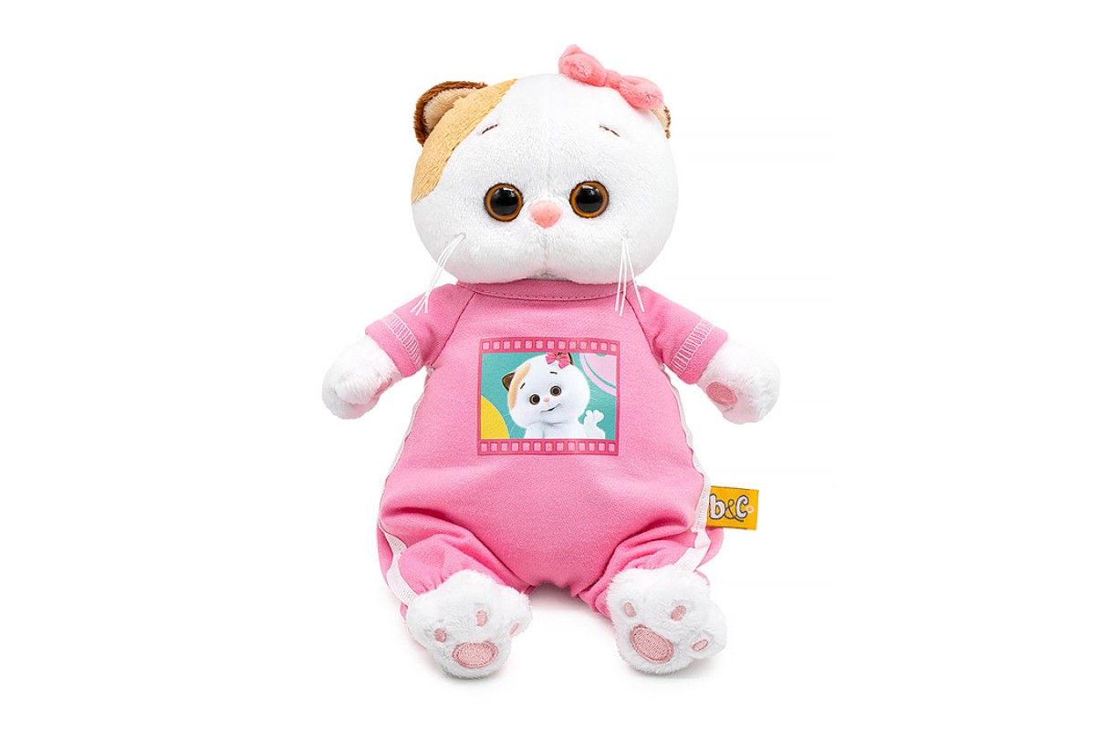 Кошечка в розовом комбинезоне из х/б трикотажа с принтом кадра из мультсериала.