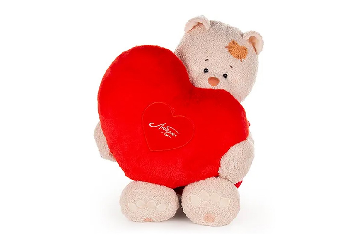 Кошка Мэри в красном платье, с сердцем подушкой алой 37см