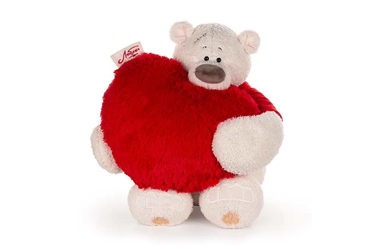 Медведь Тато в красной майке, с сердцем подушкой пушистой 37см
