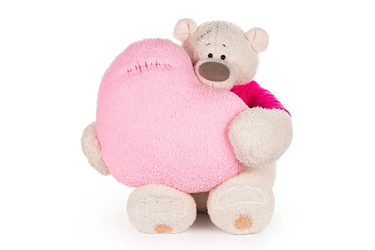 Медведь Тато в майке фуксия, с сердцем подушкой розовой, 37см