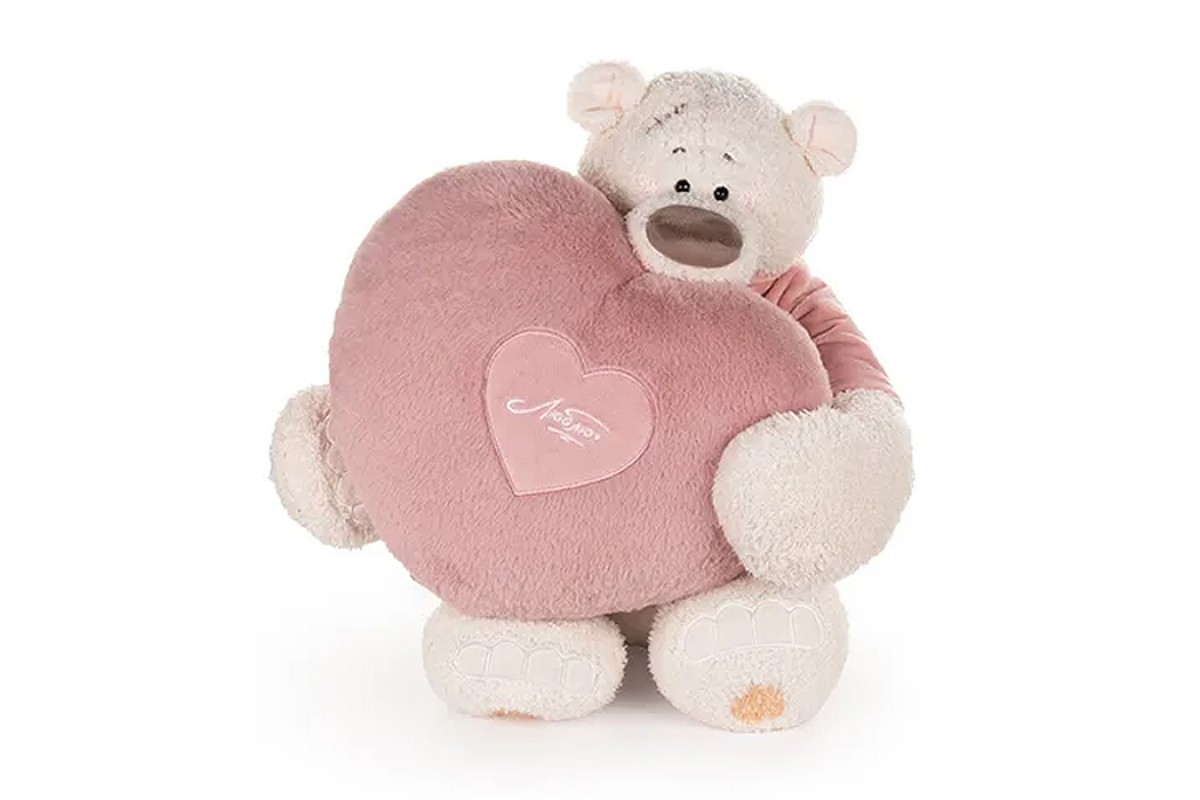 Медведь Тато в майке т. пудровой, с сердцем подушкой т. пудр 37см