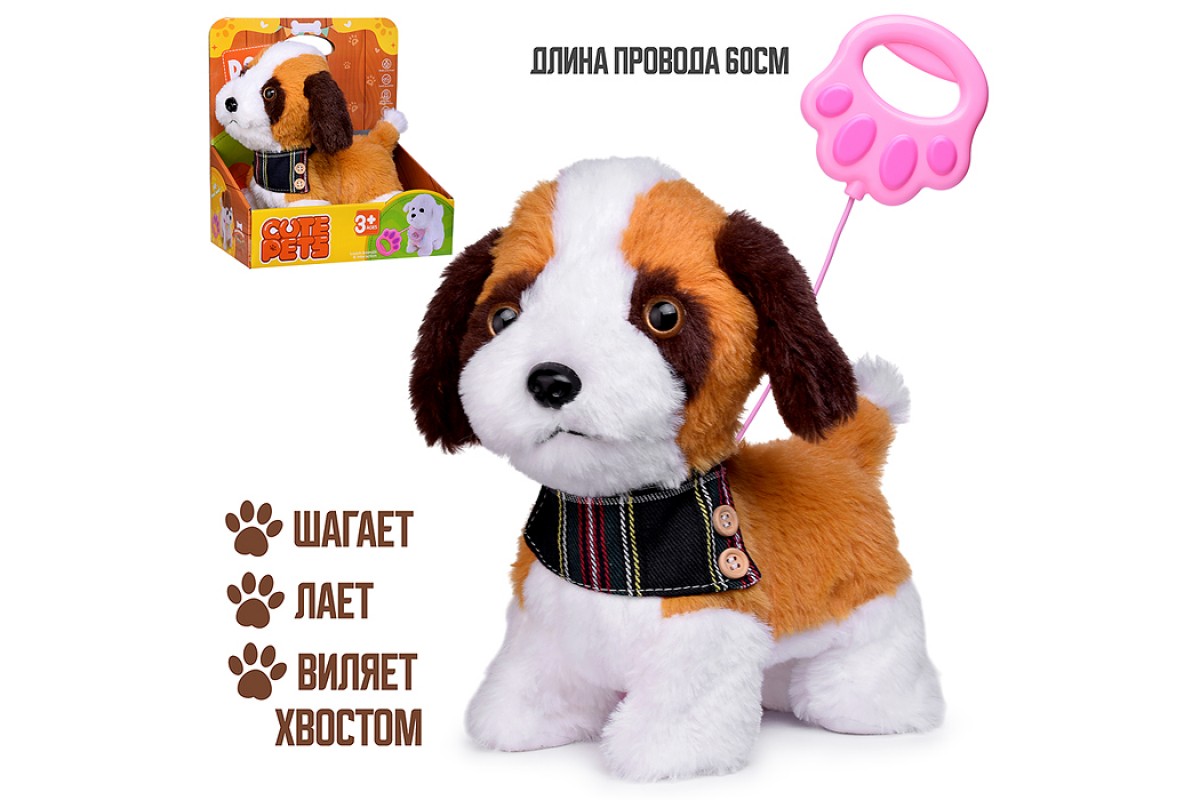 • При нажатии кнопки на поводке передвигает лапами и лает.