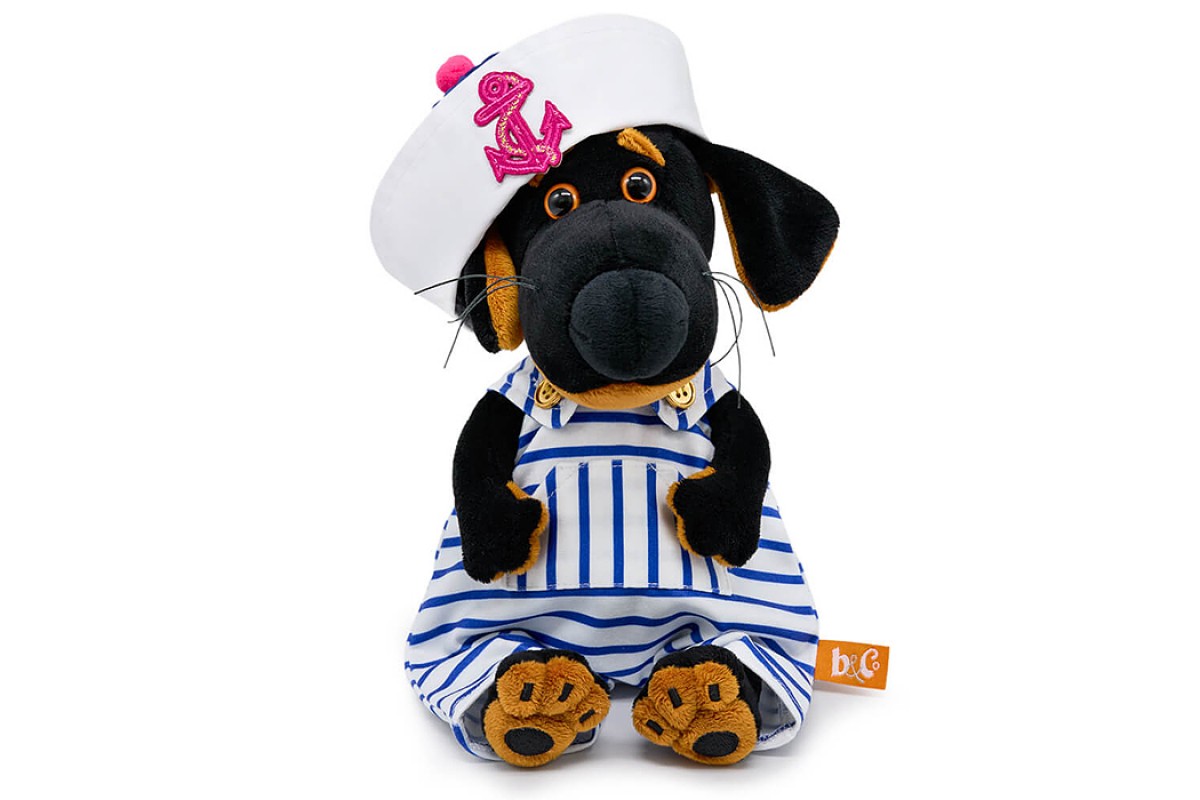 Собака Ваксон BABY в полосатом комбинезоне и панаме с якорем