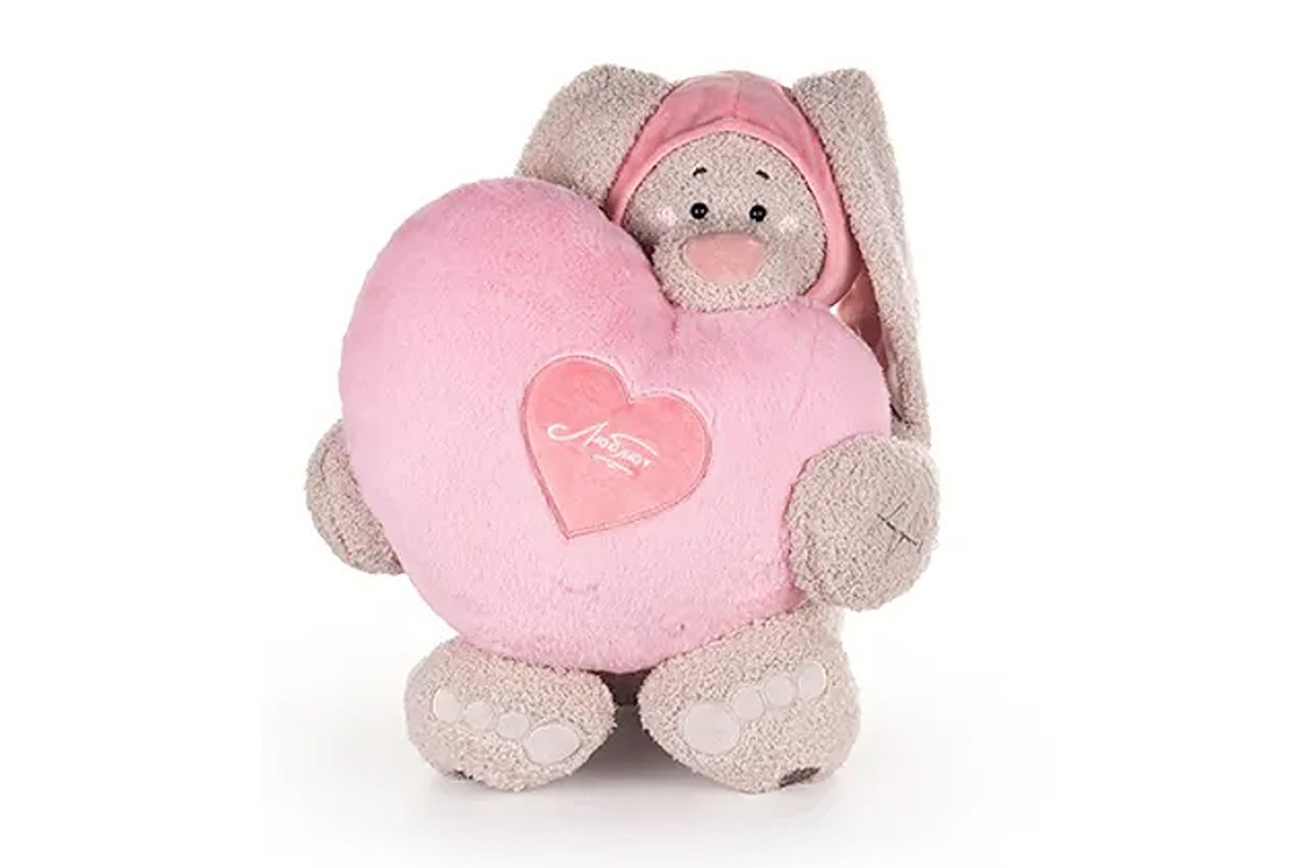 Заяц Вито в пудровой кофте, с сердцем подушкой пудровой, 37см