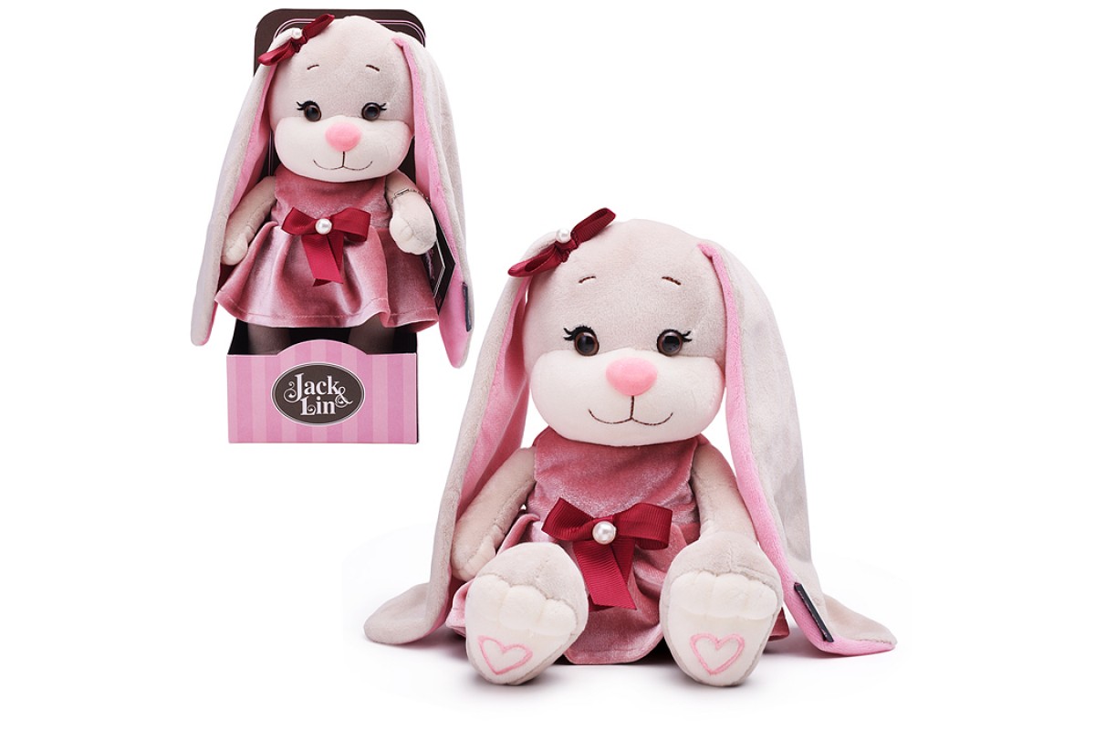 Зайка Лин в розовом бархатном платьице с бантиком, 20 см