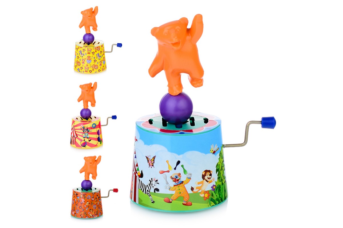 • При повороте ручки, играет мелодия "калинка-малинка", медведь крутится.