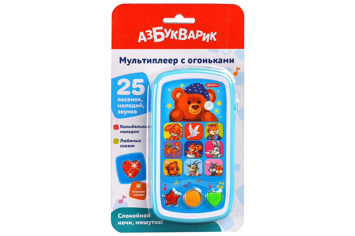 На красочных кнопочках – 18 колыбельных песенок и мелодий и 6 сказок («Маша и медведь», «Кот, петух и лиса», «Коза-дереза» и другие).